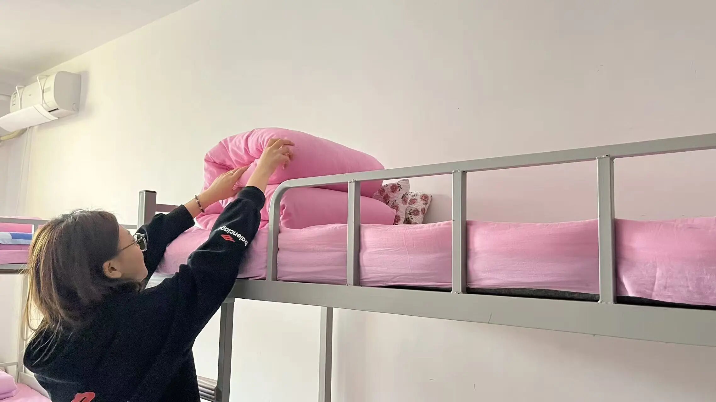 活动现场,同学们化身“生活设计师”,从细节处打磨宿舍的每一处角落:镜头里,女生宿舍的同学正细心整理床铺,粉色床品在阳光下晕染出柔和暖意,将简约空间晕染出青春的明媚质感;另一侧,男生宿舍的成员有序归置生活用品,水壶、折叠桌椅的整齐摆放,让有限空间兼具实用与整洁,熊猫元素收纳袋的点缀,更添几分活泼趣味。
