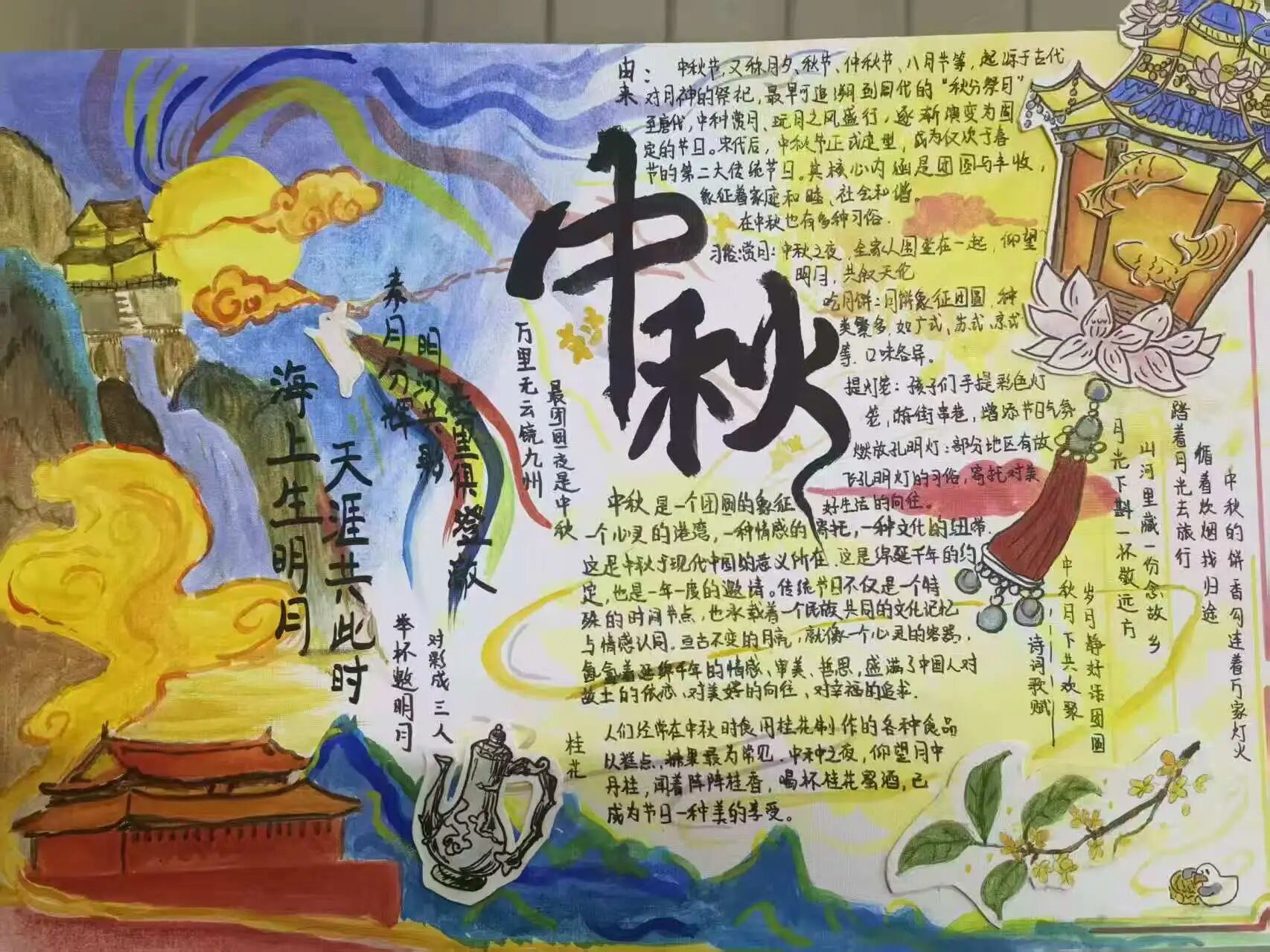 为了充分激发大家的创作热情,展现其艺术才华和对传统文化的理解,营造欢乐、祥和的节日氛围,增强集体凝聚力。让同学们深入了解中秋节的传统习俗、文化内涵和历史故事。围绕中秋主题,创作图文并茂的手抄报。内容可包括中秋传说、诗词歌赋、习俗介绍、个人感悟等。